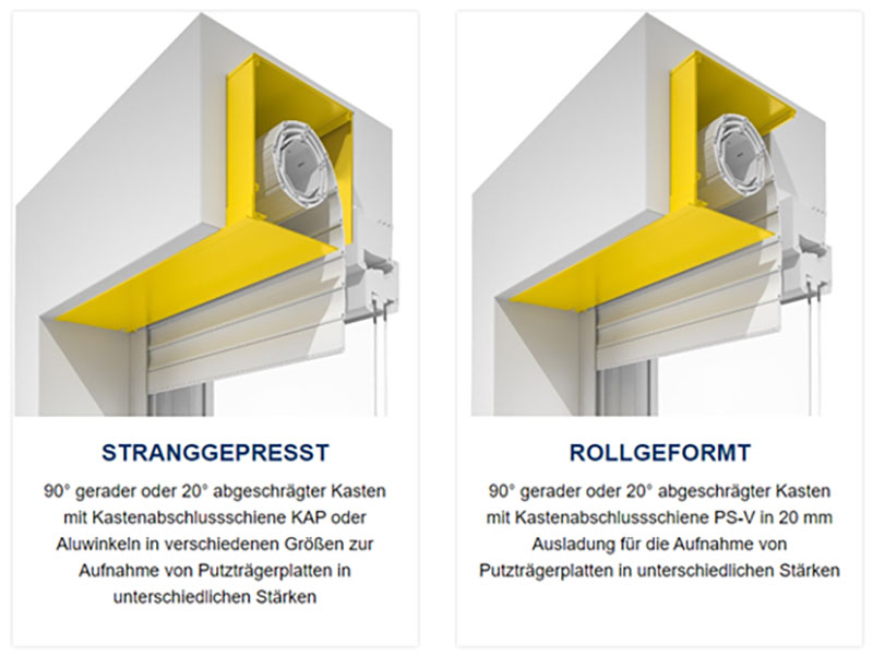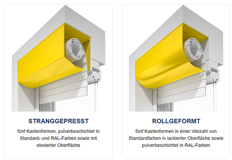 Formstabile, hochwertige Rolladenkästen aus stranggepresstem Aluminium sind robust, belastbar, langlebig und wartungsarm. Das Exklusivprogramm mit den stranggepressten Blenden bietet Lösungen für besonders große Rolladenkonstruktionen und außergewöhnliche architektonische Wünsche.